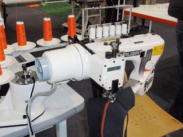 Плоскошовная машина цепного стежка с цилиндрической рукавной платформой, 4-игольная, 6-ниточная, с нижним и верхним застилом, расстояние между иглами 5,2 мм, горизонтальная обрезка одного слоя материала. Пневматический подъем лапки, отсос остатков материала. Энергоэкономный серводвигатель 230 В, макс. скорость шитья 4.200 стежков/мин. Машина предназначена для шитья плоских эластичных швов в стык, например, в производстве нижнего белья. Машина в комплекте с промышленным столом и серводвигателем.