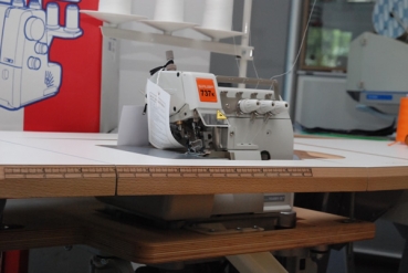 1 Nadel- 3 Faden Overlockmaschine [Stichtyp 504], für mittlere Ware, Überwendlichbreite 4 mm, Differentialtransport unten 0,7-2, maximale Nähgeschwindigkeit 7500 Stiche/min, direkt angetriebene Nadelstange und verbesserte Zentralschmierung. Komplett mit Gestell und