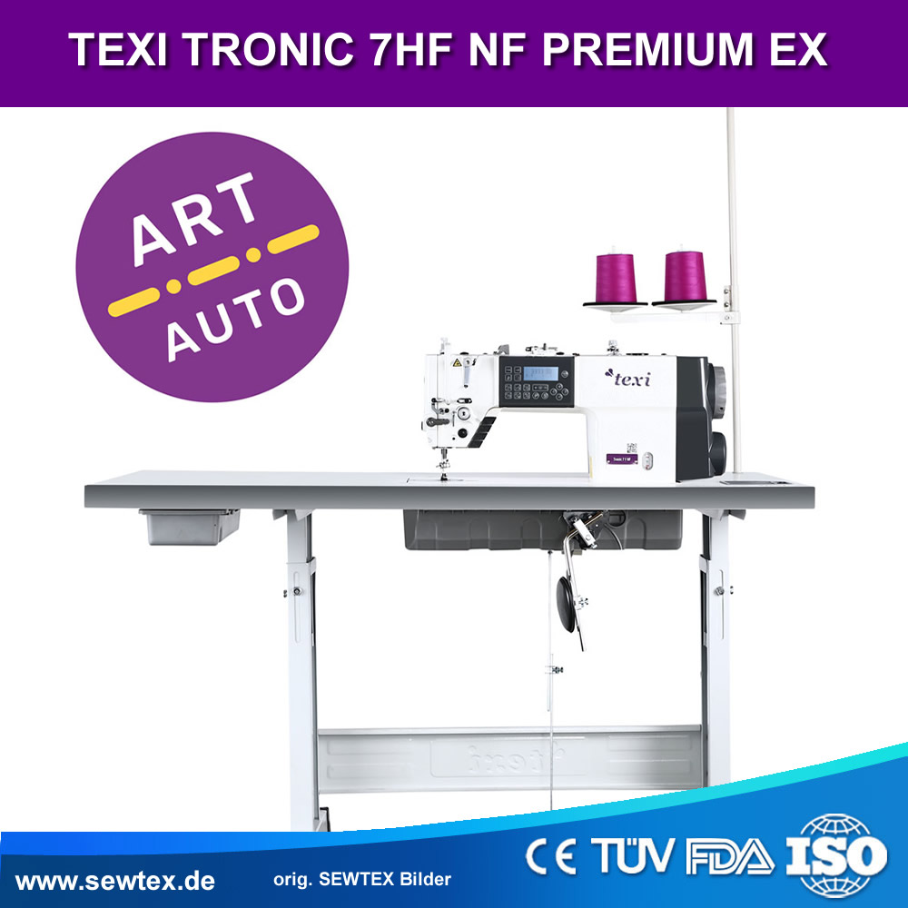 The TEXI TRONIC 7HF NF PREMIUM EX from the TEXI FUTURE series is a high-performance automatic single-needle lockstitch machine with needle feed (bottom + needle transport), integrated stepper motor for extremely quiet and vibration-free running, and a complete automation package including programmable ART AUTO decorative stitches. Optimized specifically for medium to heavy fabrics – successor to the popular TEXI TRONIC 7 NF.